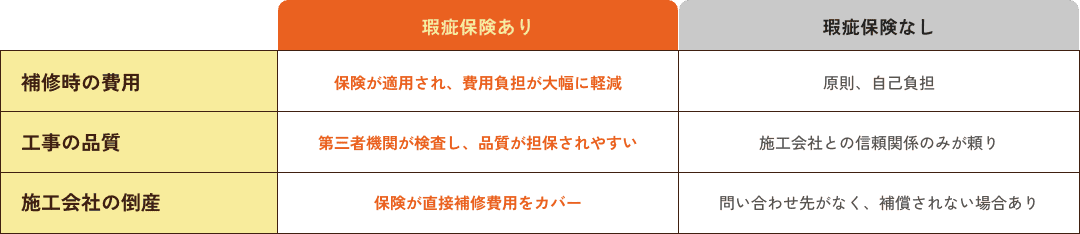 リフォーム瑕疵保険は、万が一施工後に欠陥や不備(瑕疵)が見つかった場合や施工会社が倒産した場合でも、公正な立場で審査や検査を行う第三者機関が工事の補修費用を補償してくれる制度です。また補償だけでなく、工事の進行状況や完了後の品質検査なども実施されるため工事の信頼性も上がります。